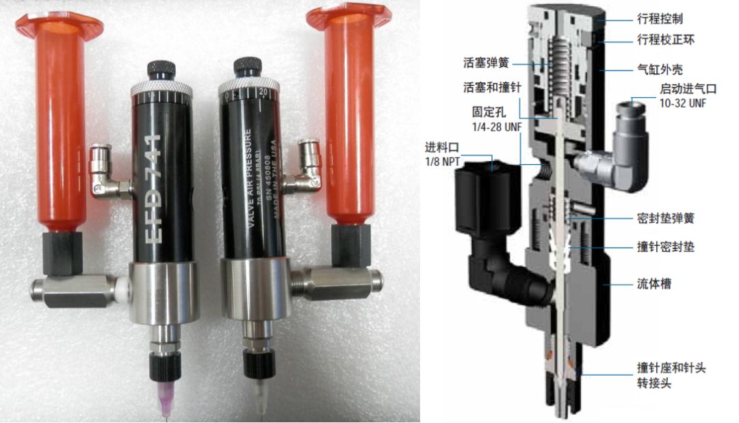 EFD的741自己也摸索了很久,始終沒有點出來,原因就在于不知道還有一個黑色的旋鈕可以調(diào)節(jié)。調(diào)節(jié)好這個旋鈕以后出膠量就會變小了。針頭選用的內(nèi)徑是0.15mm的不銹鋼針頭。(下圖為 EFD 741撞針閥的實物和剖面圖) 另一種的UV閥門不知道是哪個廠家的(藍色,待補充),相比EFD少了一個旋鈕,無論如何努力就是沒法調(diào)節(jié)膠量的大小。(出膠量和針頭的大小,以及針頭的性質(zhì)有關(guān)),世宗的閥門有個千分尺可以調(diào)節(jié),但是用到我的膠閥上,效果也是不行,主要在于關(guān)不住膠水。 至于膠管+控制器的形式是最為簡單的結(jié)構(gòu),出膠在一定的壓力下可以很順暢,就像一條線似的。但是在不換針頭的情況下幾乎很難調(diào)節(jié)膠水的出膠量。 針頭的類型接觸過的有鐵氟龍,不銹鋼包裹鐵氟龍,不朽鋼。根據(jù)需要選定。針頭越長,越不好出膠。鐵氟龍的會出得比較順。